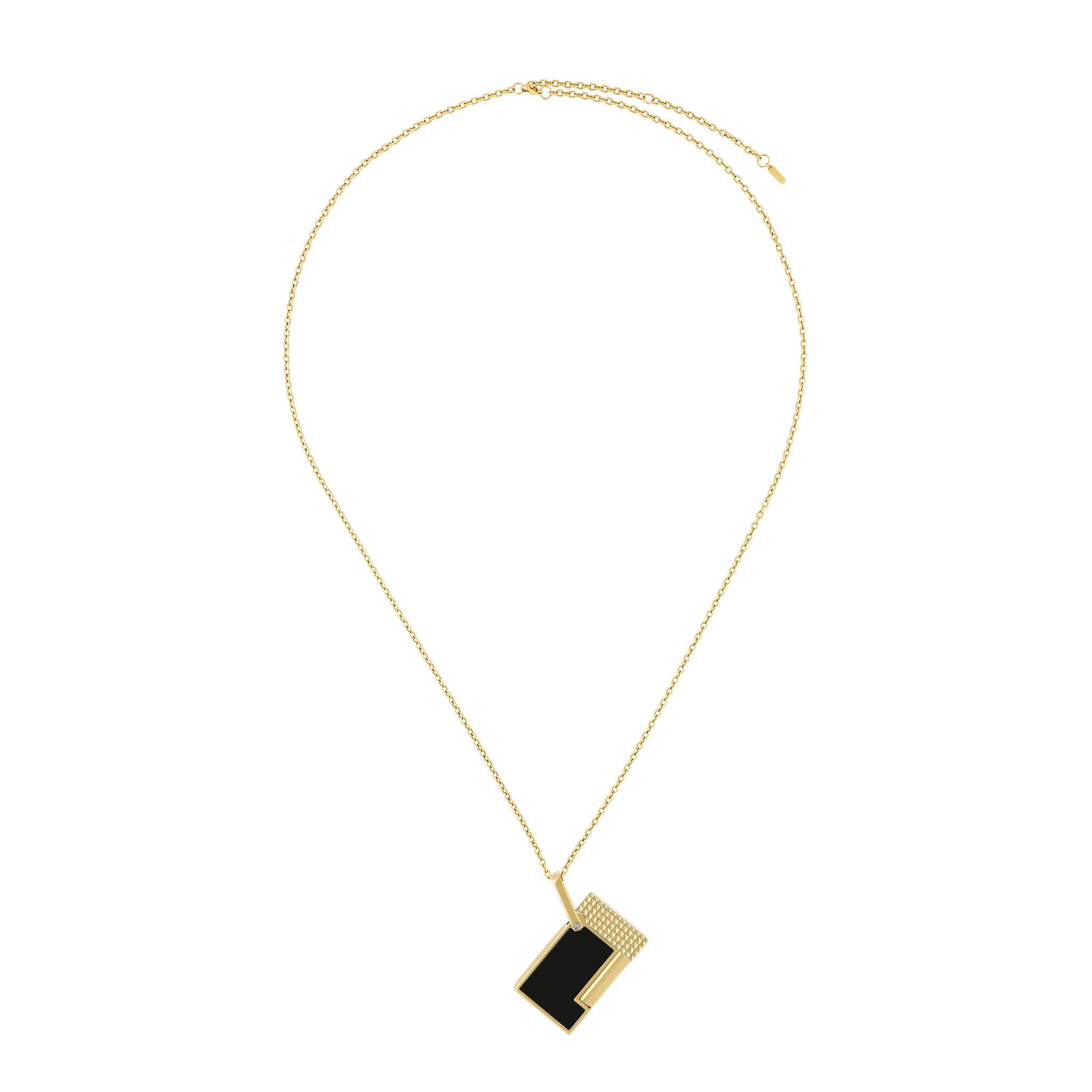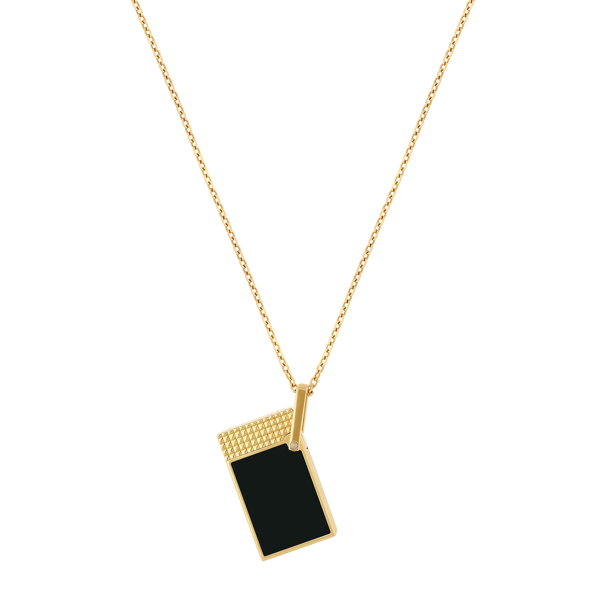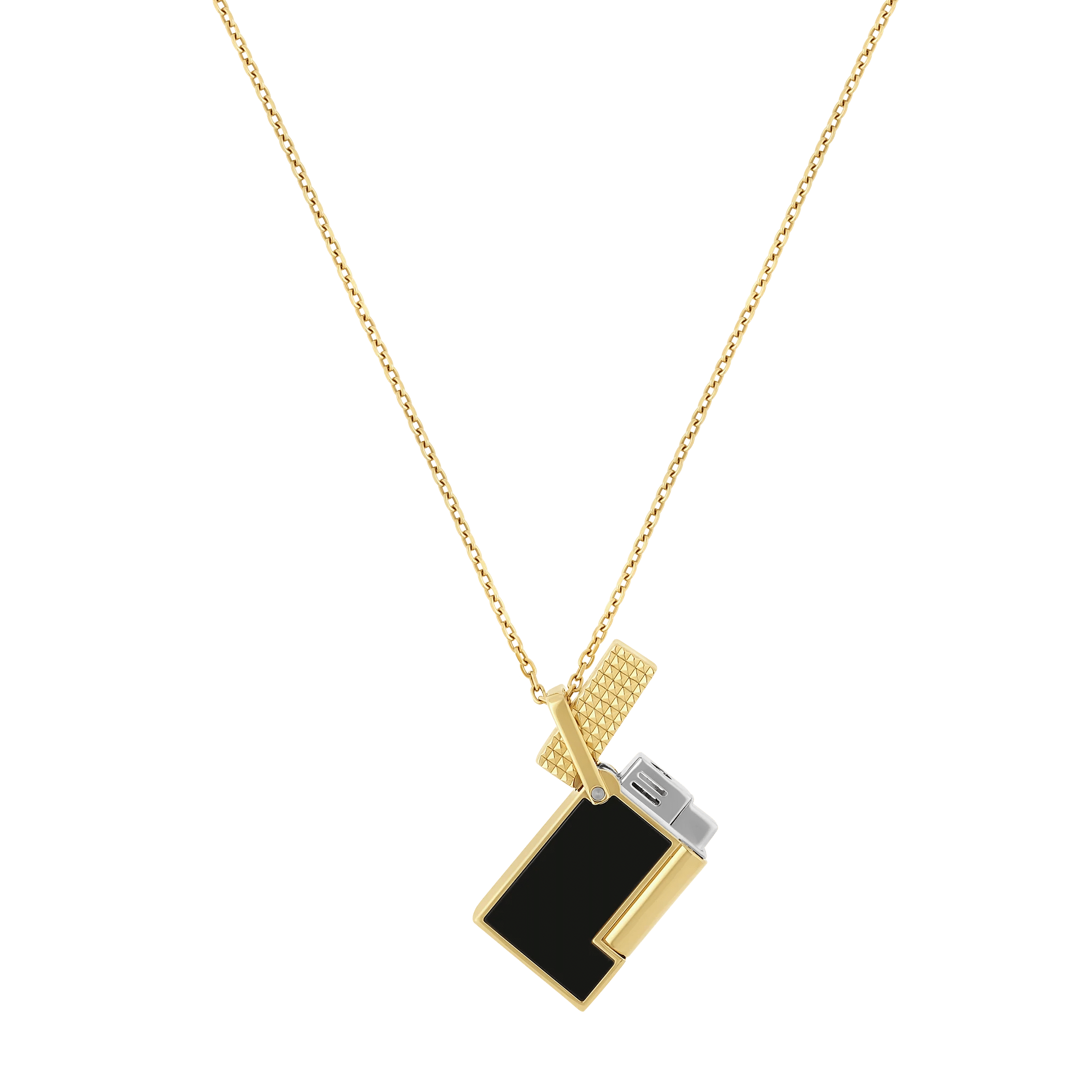 Lighter necklace glossy black lacquer in iconic guilloché with diamond tip and gold finishes. Removable and adjustable chain in three different lengths 80/85/90cm.Â