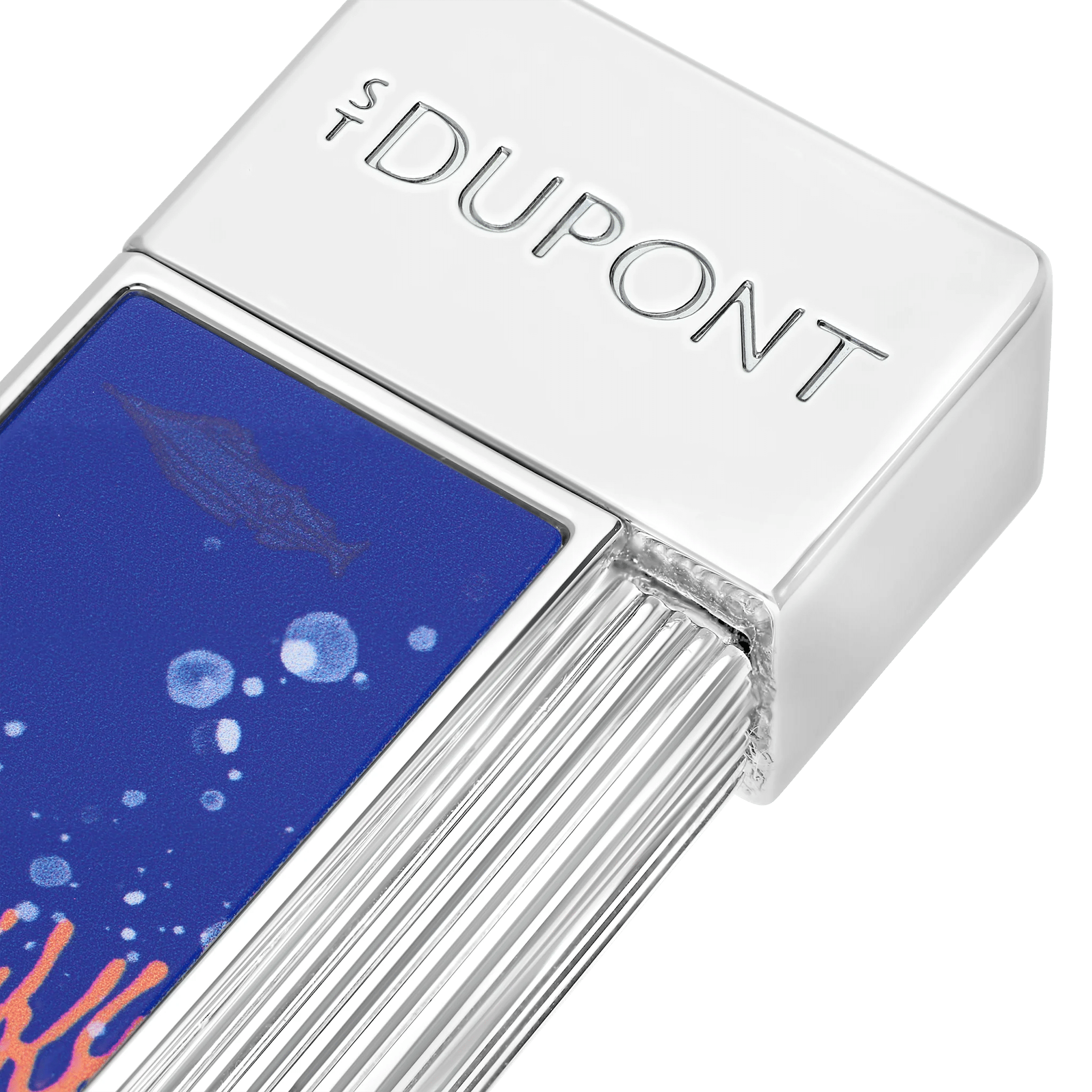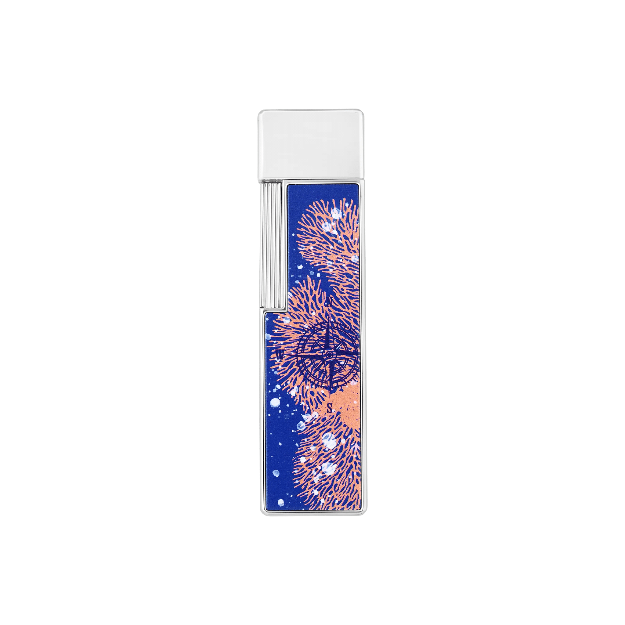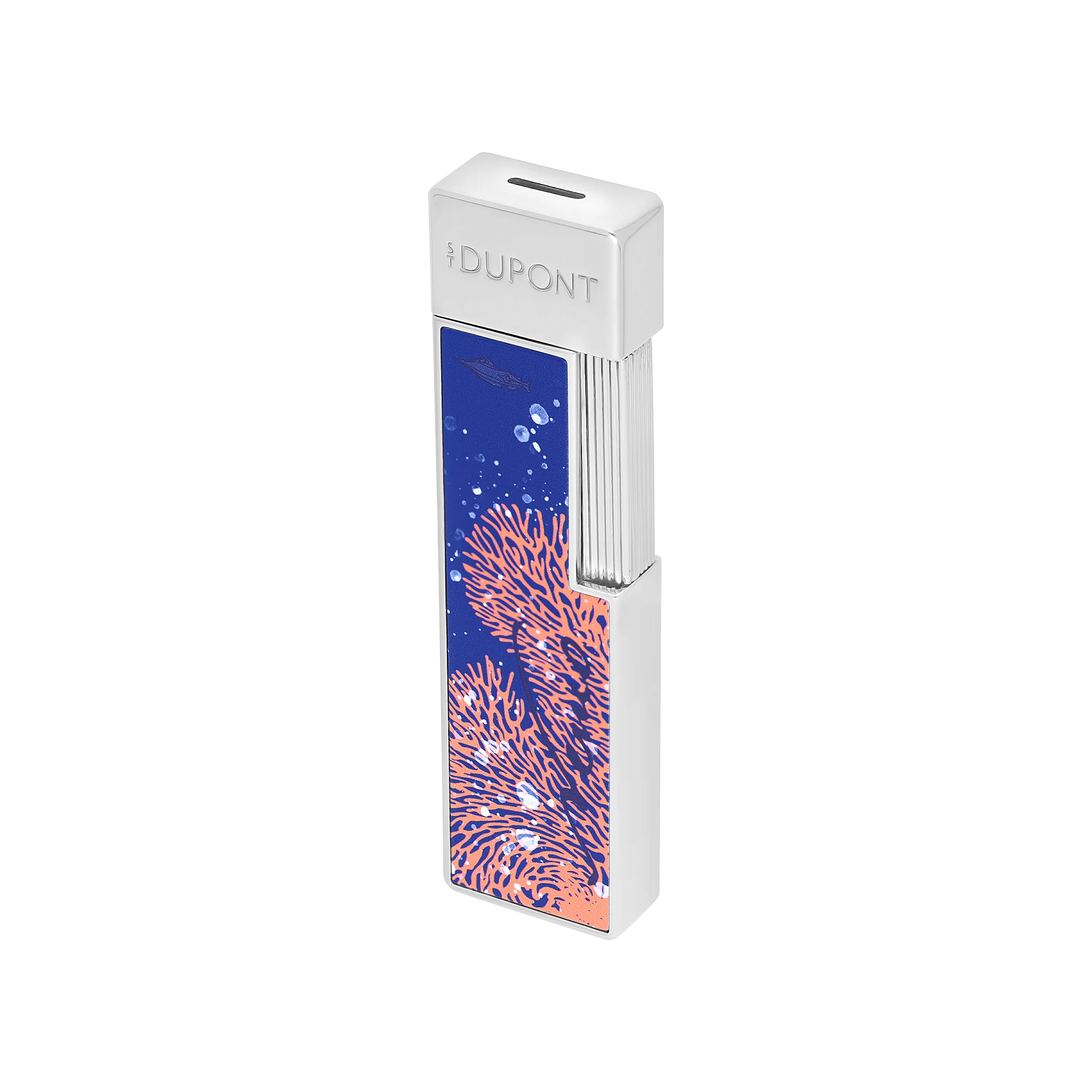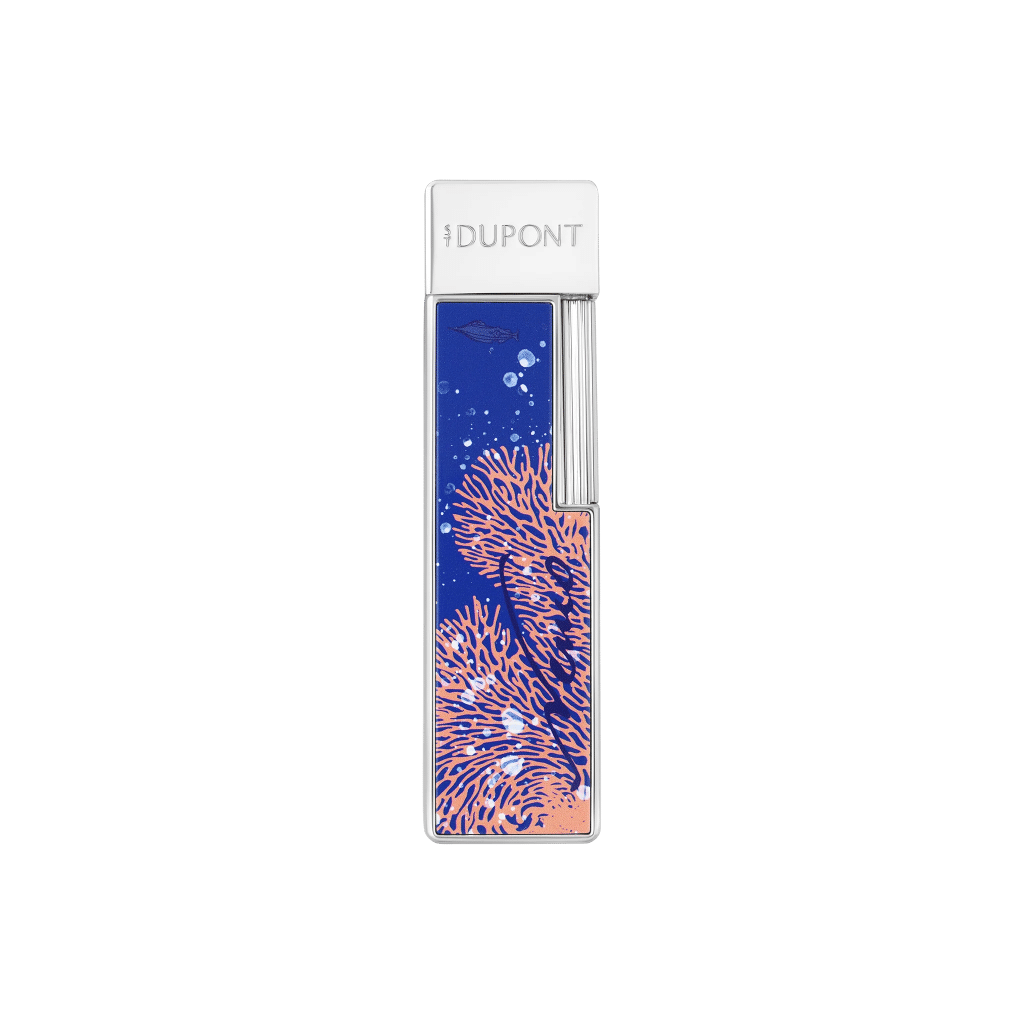Tribute to the captivating universe of 20,000 leagues under the seas, this limited edition expresses all the know-how of S.T. Dupont. Published in 1870, the novel recounts the journey of three castaways captured by Captain Nemo, this mysterious inventor who travels the seabed aboard the Nautilus, submarine very ahead of the technologies of the time. Portholes, turbines, corals, fins and other tentacles of giant squid inspire this limited edition and its three ranges, all related to different chapters of the book. A story in three stages in which to dive with passion. ‘Vanikoro’ is named after its pattern ‘corals’. In the chapter of the same name, Captain Nemo and his three companions dock on the island of Vanikoro, surrounded by an incredible barrier reef. Twiggy lighter in shiny blue lacquer, with the Vanikoro decoration. Chrome finish. Equipped with a 1 cm blue torch flame, ideal for lighting candles or cigarettes.